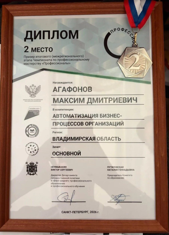 Максим Агафонов, студент Владимирского политехнического колледжа, завоевал серебряную медаль в компетенции «Автоматизация бизнес-процессов» на итоговом межрегиональном чемпионате по профессиональному мастерству «Профессионалы». Это достойная награда за упорный труд, стремление к знаниям и высокий профессионализм. Максим, ты — настоящий пример для всех студентов и гордость своего колледжа!